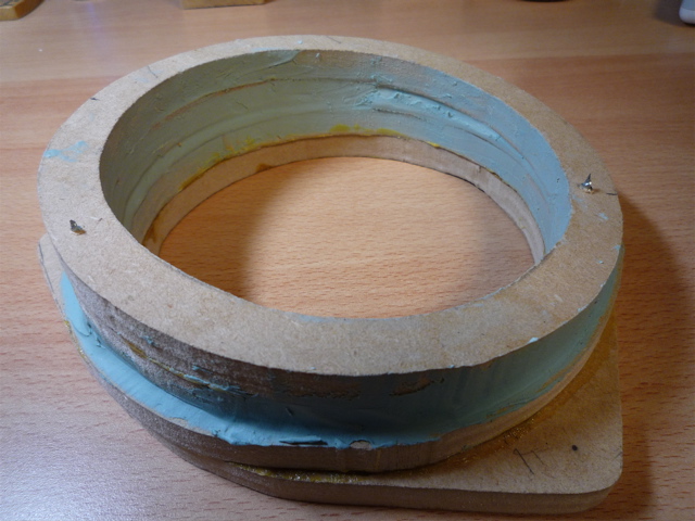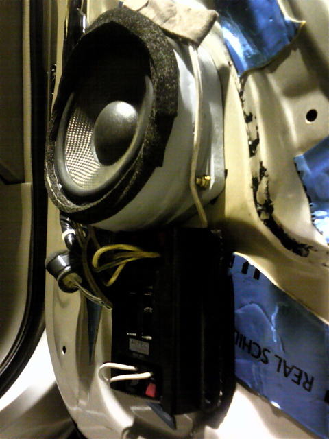 音の定位を足元付近より耳の位置に上げたいので、傾斜の付いたインナーバッフルをMDFとパテで作製→プライマー塗って防水加工→内張りの干渉部分を取り除き→ガッツリ固定→スピーカー取付け。
