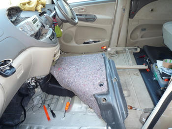 フロントのシートはレールも取り外して、タイヤハウスとフロアーのデッドニングです。