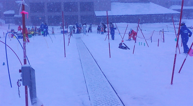下段中央には、スノーエスカレーターが設置されていて、滑り終えた子供達はドンドン上がって来る、、、滑走コースは5タイプで、それぞれの先生に子供らを振り分ける、、、手を貸したり、ダッコしたり、、、、、さらに上段には、プチロープ塔、、、ロープに摑まってコース横を登って行っての滑走、、、TVの取材も来ていたし、人気沸騰中です。