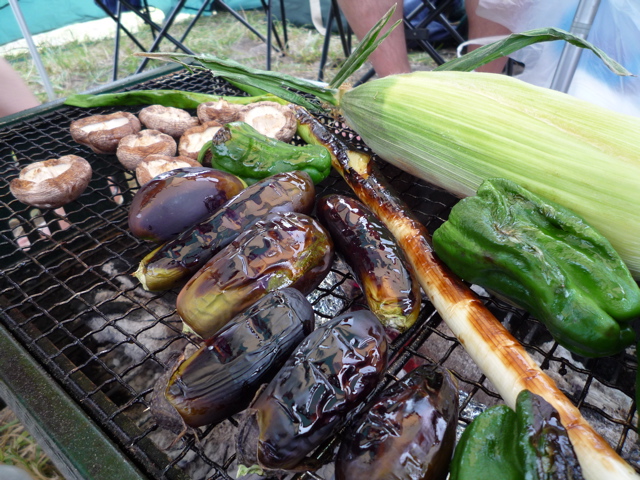 シノがおばあちゃん家の畑から持参した野菜と、大好きなトウモロコシ等、テリテリに焼き上がって来ました!