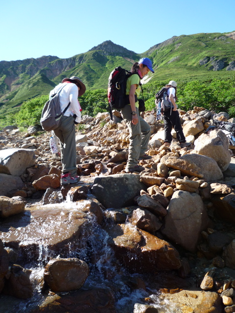 登山道は変化にとんでいて、小石、土、岩、階段、沢水、、、、