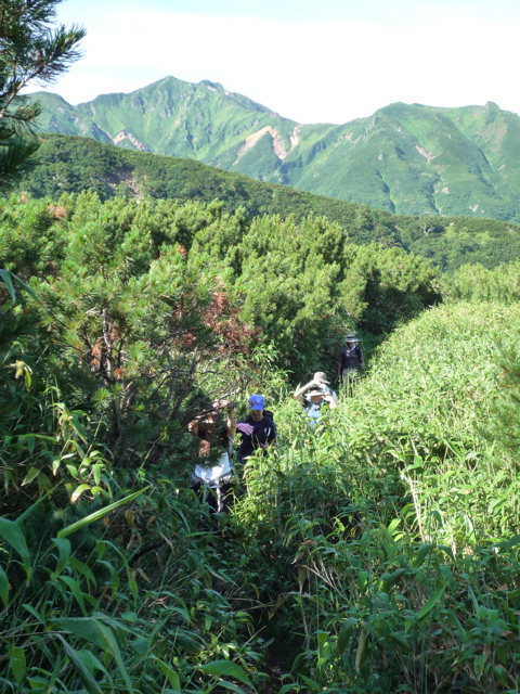 前半は朝露の残る笹薮地帯を急登ですが、後ろには昨日の富良野岳が、、、