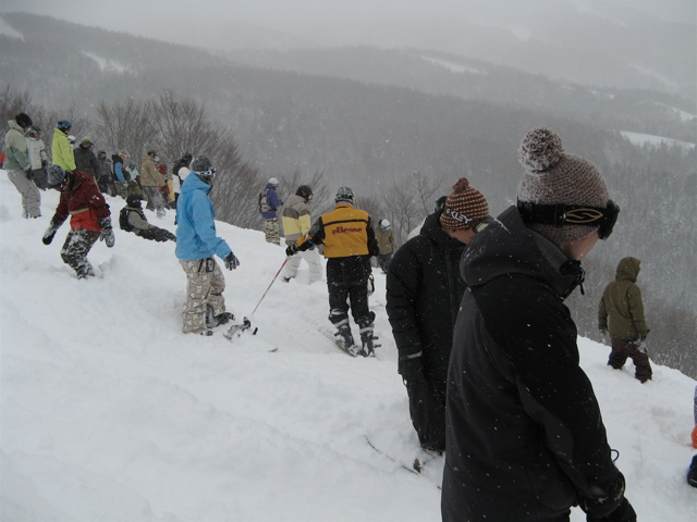 閉鎖コースのネットをくぐって集まったのが50人程、、、先頭にパトロールがいて足止めされました。『滑らないで下さ〜い!! 止まってくださ〜い!! 』 『このコースはまだチェックしていないので待ってくださ〜い!』、、、待てば滑れるの??、、、パトが2人になって、、、チェックしてたら、誰かがドロップしたらしく、つられた皆はいっせいに、、、38°のオープンバーンは雪煙の中で、一瞬にして食い尽くされました。。。。