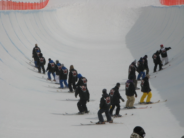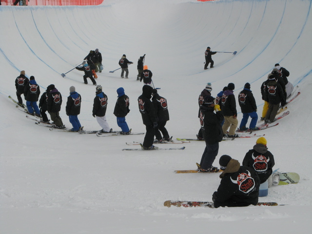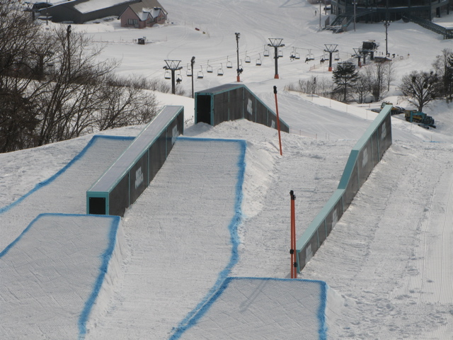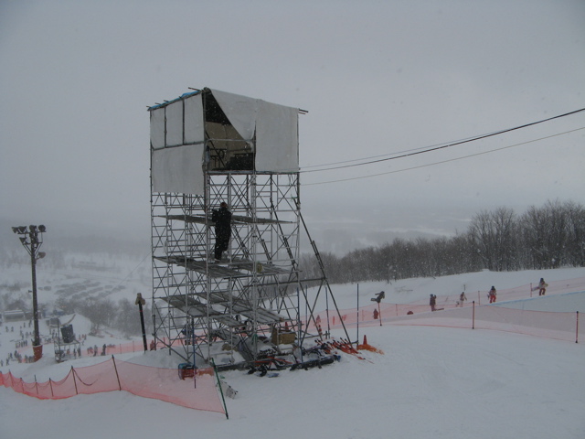 13時からはスーパーパイプの公式練習で、パイプ横にはパイプ用のロープ塔が常設されています。