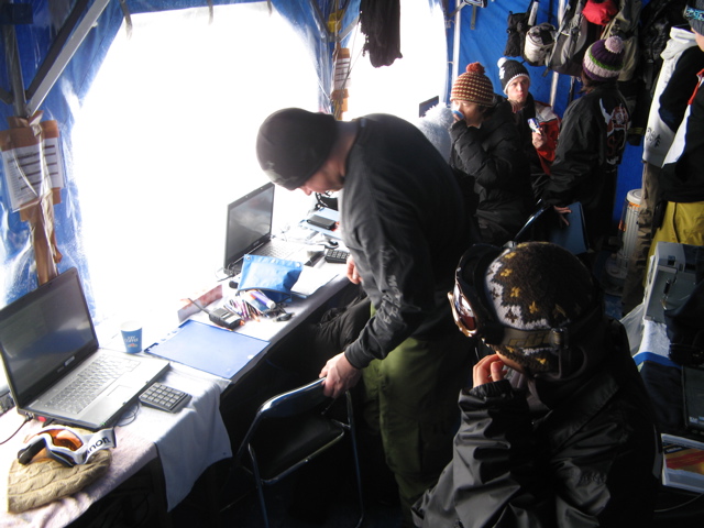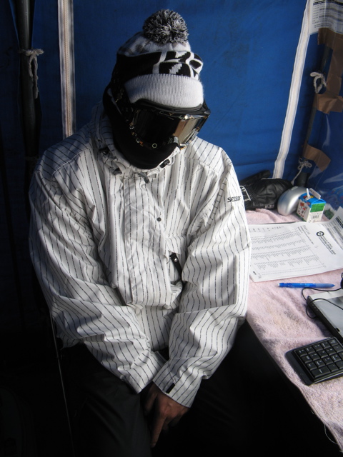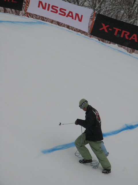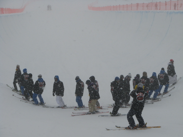 朝方からの暴風雪で、9時30分には公式練習を開始したものの、競技は11迄ウエイティング!
