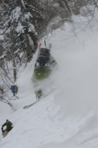 北の峰の駐車場へ車を止め、”熊落とし”からのスタートになり、、、チョットハイクで端からドロップインのエトさんも今日はスノボで攻めます。