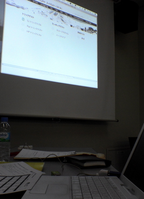 今年度は、更新講習のみなので、DVDを利用してのストレートジャンプ、レールトリック、スロープスタイル、ハーフパイプのそれぞれについて、トリックの確認、トリックの完成度の見極め、順位付け、学科模擬試験、トリックと順位付け模擬試験を終日タップリ実施いたしました。