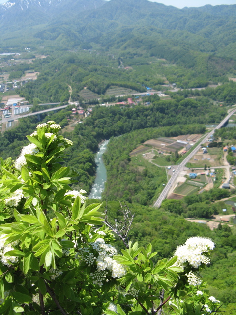山頂の岩の隙間に咲くこの花の奥の川では、ラフティングやってました。