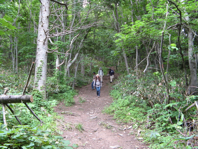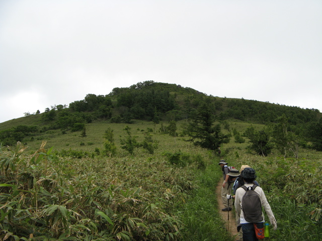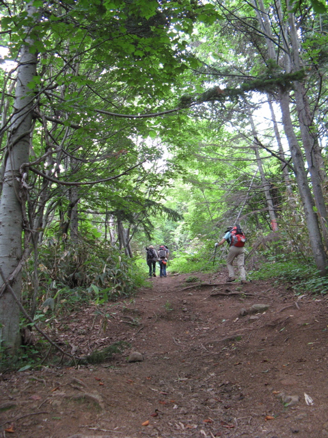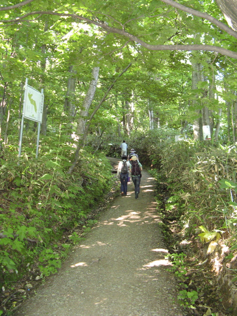 土の色が変わって、左に見えるイワオヌプリ1080mへと歩きます。