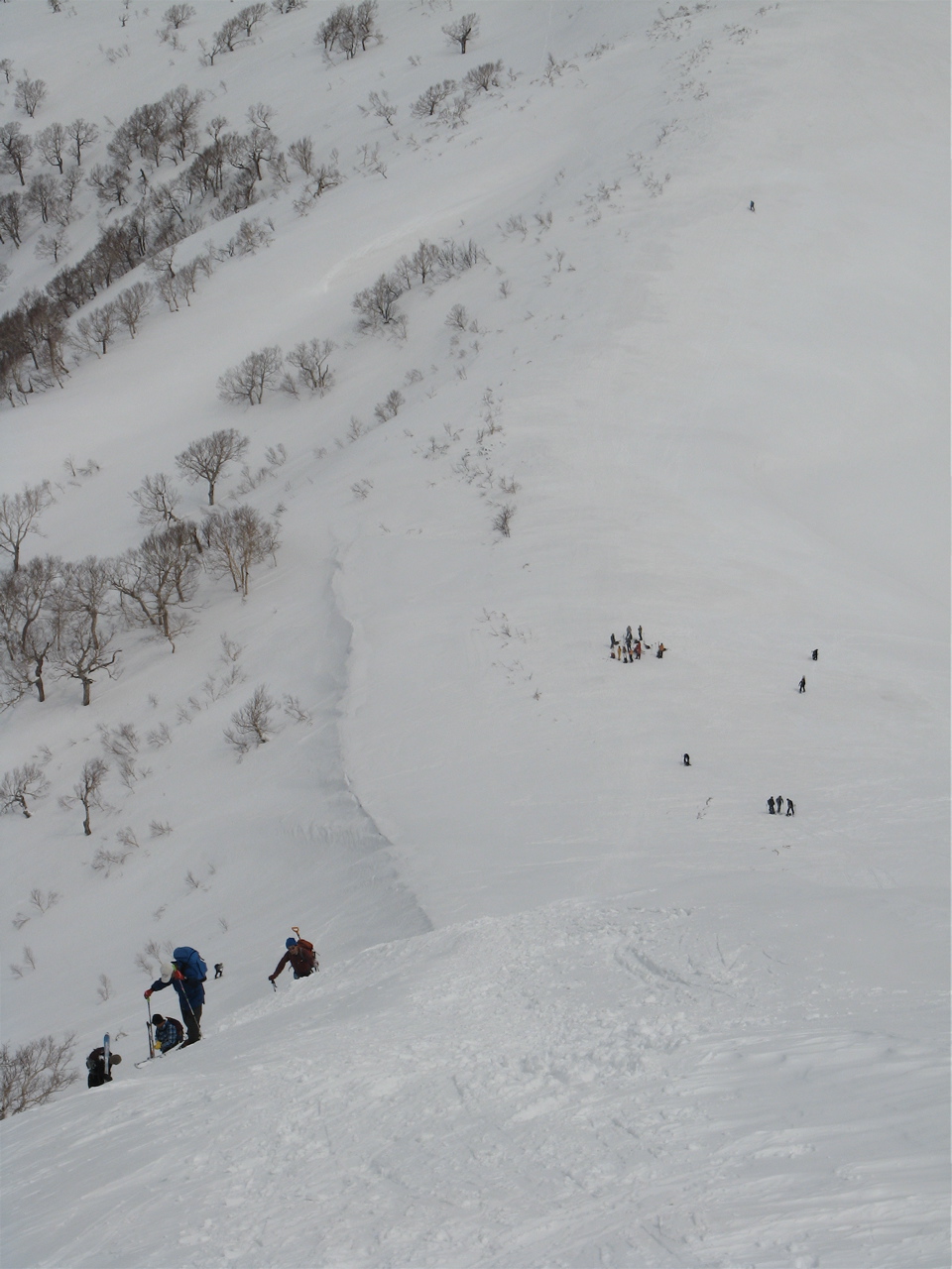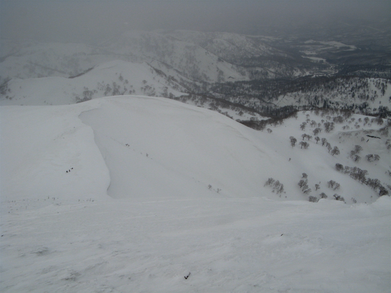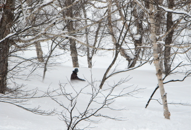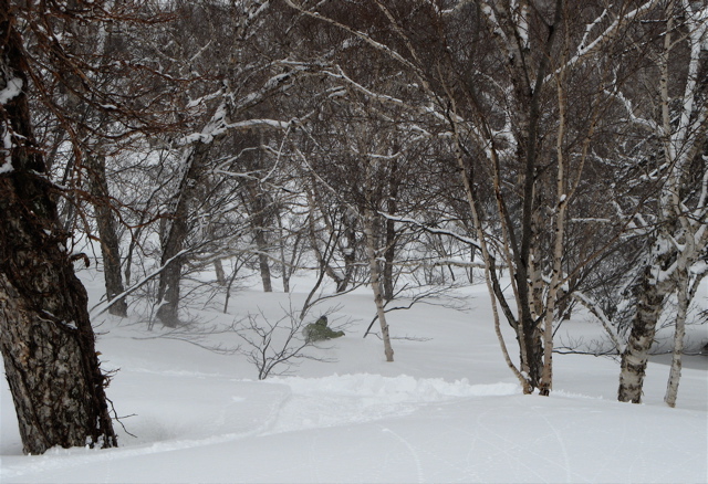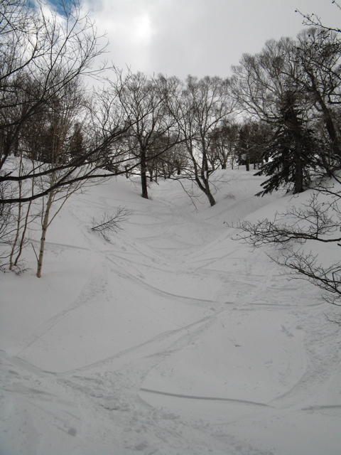 余市第2リフト正面から見える斜面を降りて、沢の中に消えて行きましたが、雪付は南東斜面やセッピ下の方が断然良かったです。