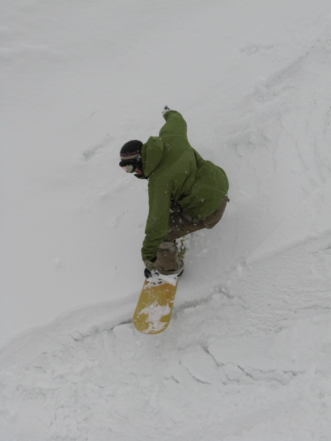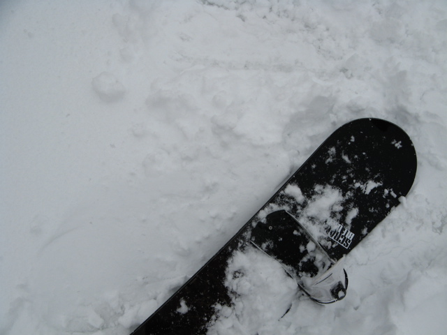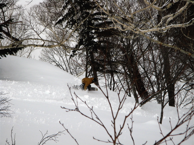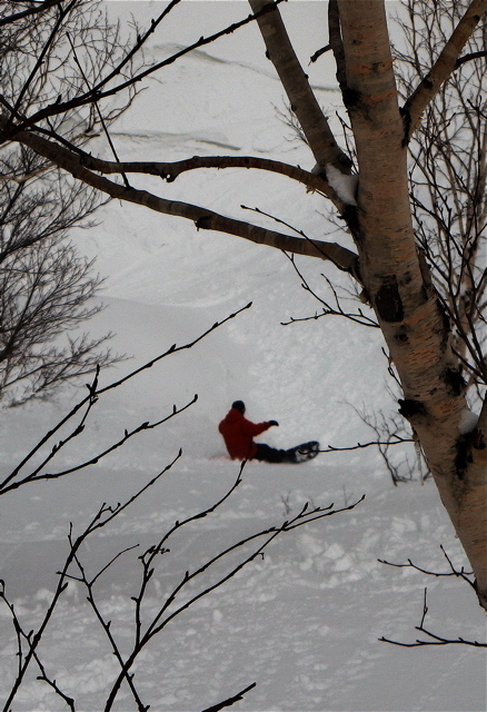 最後の一本で、『必殺板つかみ』にヤラレテ(フロントサイドでのフルブレーキ)、木に激突(前足のブーツがガッチリ当たって、そこを中心に後ろ足ヒザ、後ろ手小指でダウン)、、、細い木なのにワタクシが負けました。