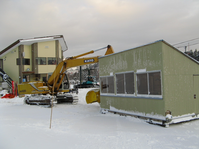ジャッジハウスは、こんなに立派な、、、ある意味なつかしい(旭川カムイのスクランブルUSAカップでは毎年レンタルしていました!)プレハブにをユンボで押して移動設置します!ちなみに、床底にはSkiみたいのがついていて、SXの大会や他のコースにも移動出来るようになってます。