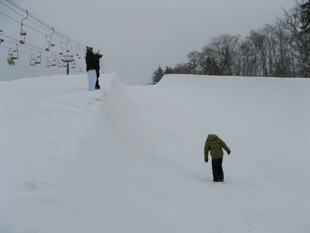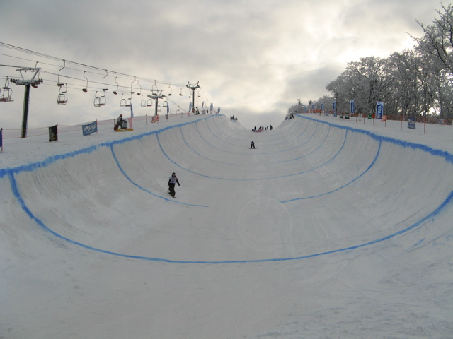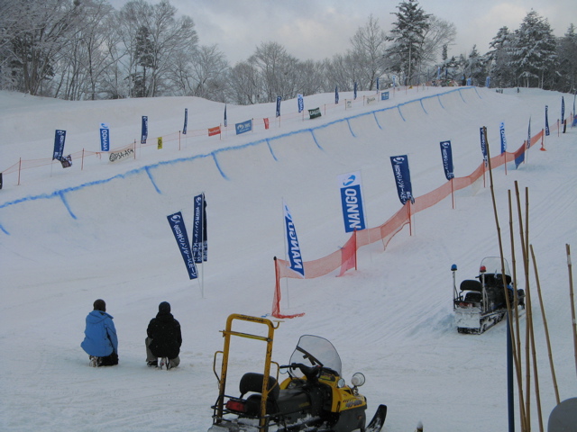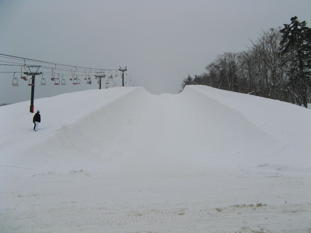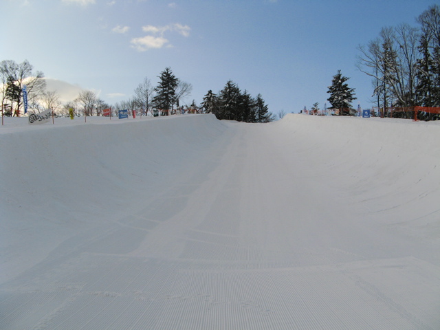 大会前に比較的暖かな気候に一度溶けて固まった堅い層が10cm程の厚さでテーブルの上部(リップ付近)にあり、その下のトランジションのアールが削れても、一部の堅い部分が残りオーバーハングになってしまう、、、跳ね返される、、、ボトム落ち、、、転倒、、、予選落ち、、、みたいな!
