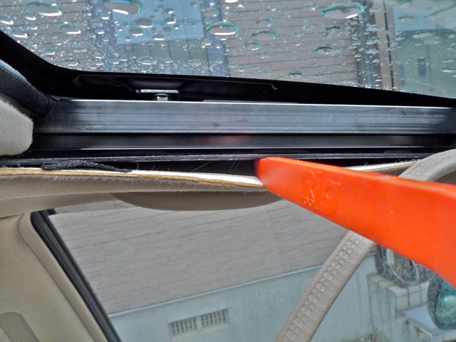 4、雨が降って来たので、スモークフィルムを貼るのは断念しガラスを付けて、キシミ音対策! これが正解!! 時々サンルーフ辺りの内張りからしていた気になる気になる”擦れ音”がなくなった〜! 天井の内張りとサンルーフ本体の間(オレンジ色の内張り剥がしをさしている部分)に薄く切ったエプトシーラーを挟んで擦れ防止。多分たいていの場合はこれで解消するはず。