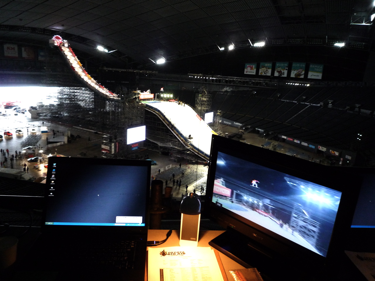 本番のジャッジングでは、ライブで見て、モニターでグラブを確認して点数を入れ込むかんじで、ジャッジシートからは正面が入力用のPCと右がリプレイモニターです。