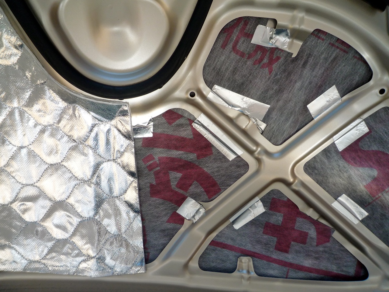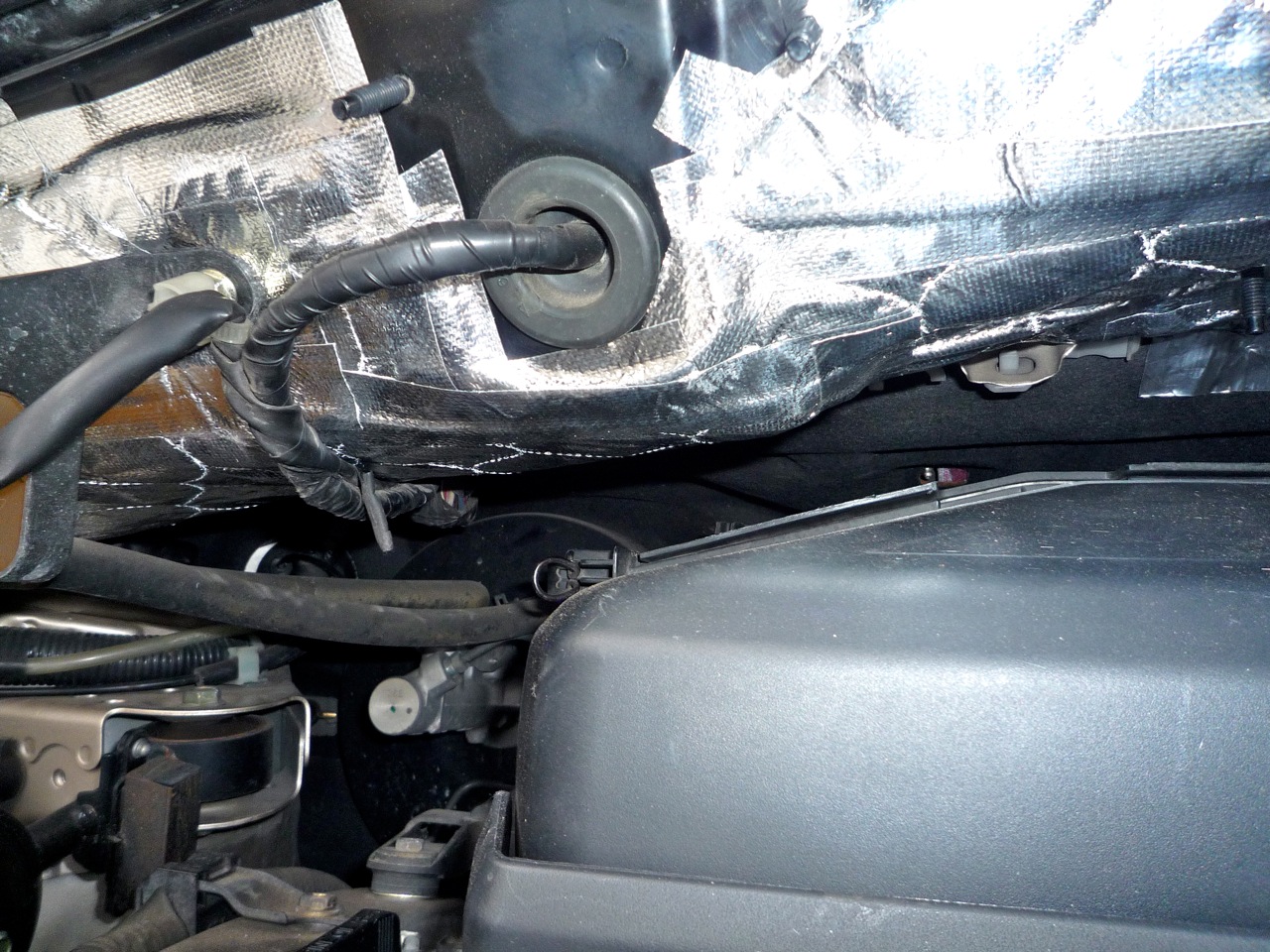 ダッシュボード上部とエンジンルームの境目に遮音材を差し込みアルミテープで固定、ボンネット裏に貼った耐熱吸音材をワイパーのモーターが付いていたデカイプレート(多分普通車ではこの部分もボンネット)に貼って終了。