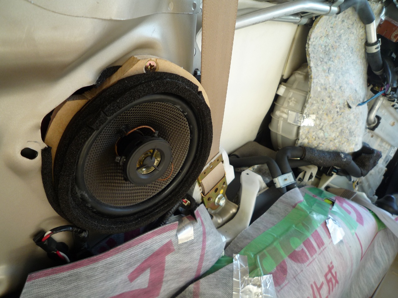ついでにリアスピーカーも入れ替え、ウーハーの配線も完了したので、来月はアンプ付けて鳴らしてみようかな、、、でも、古いスピーカーだったので、磁石の部分が大きく、ホトンド容積が取れず高音しか鳴らない感じだけど、純正のコモッタ音よりはましみたい、、、グライの予想。