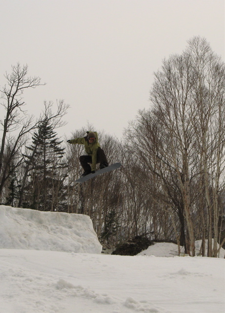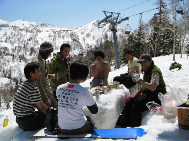 我々、イケダサン、マホ、タニ、アオシマ、レオ、ヨシヒロ、ヒラタ、キム、マメ姉は余市第二リフト降り場付近で恒例の焼肉、ビール、ポコじゃん大会でした。