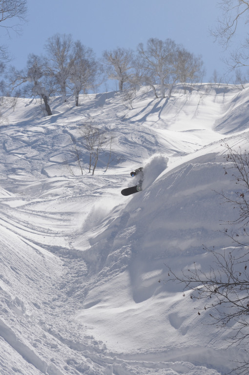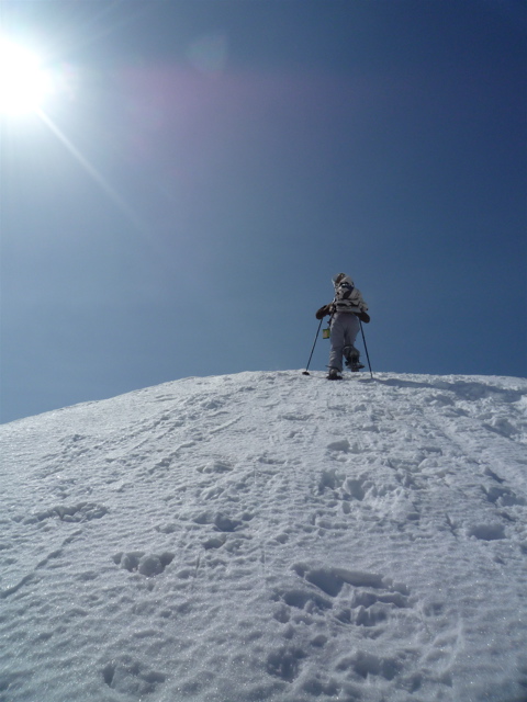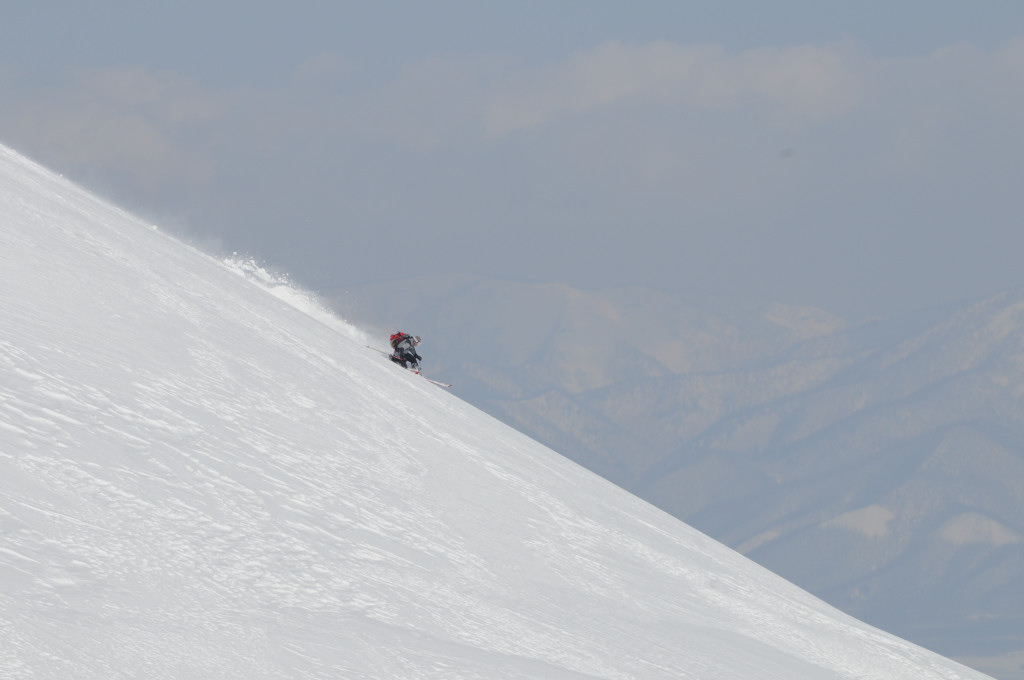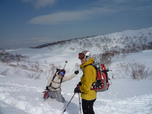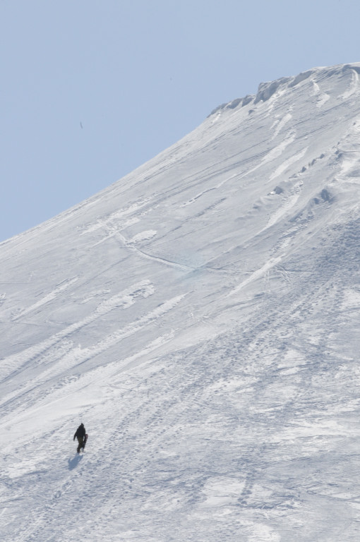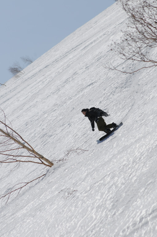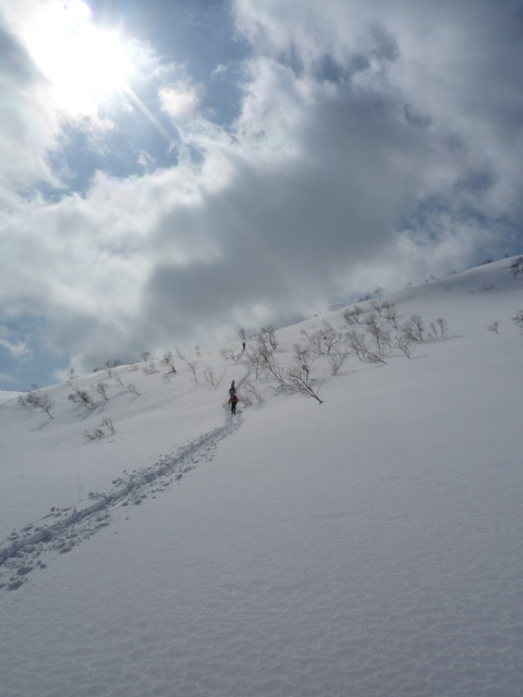 昼近くになって、斜面も緩みはじめたので、8分目位からモービルのラインを外して南東にトライ。